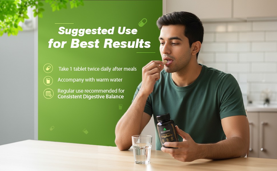Triphala tablets are used as an Ayurvedic medicine for digestion, constipation relief, detoxification, skin, hair, and liver health.