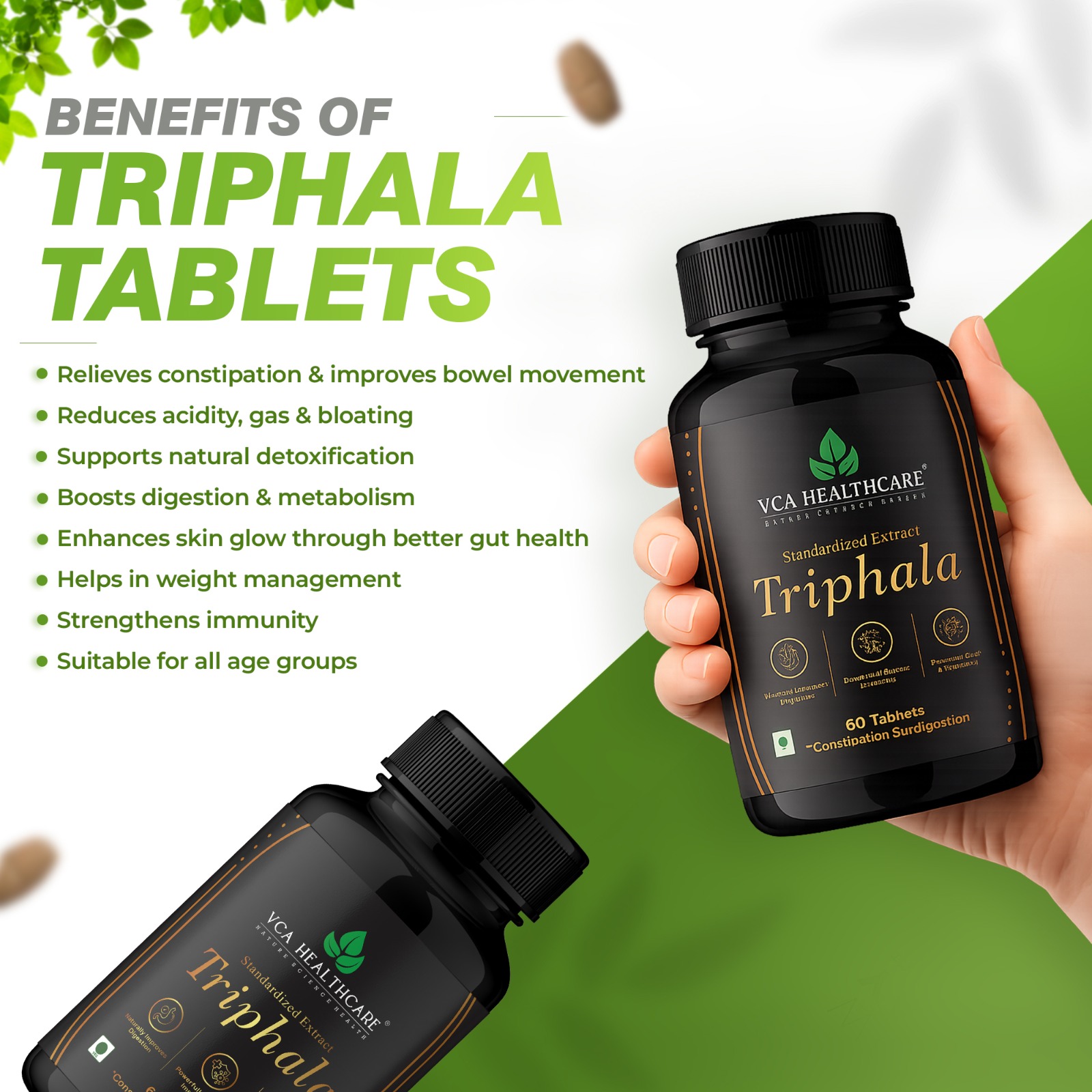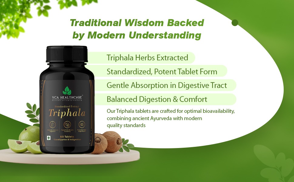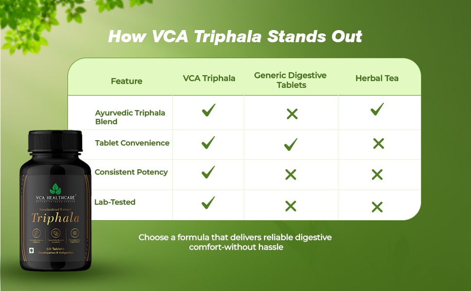 Unlike traditional Triphala churna or powders, VCA Triphala Tablets are standardized for consistent potency, better absorption, and convenient daily use, making them ideal for long-term wellness.