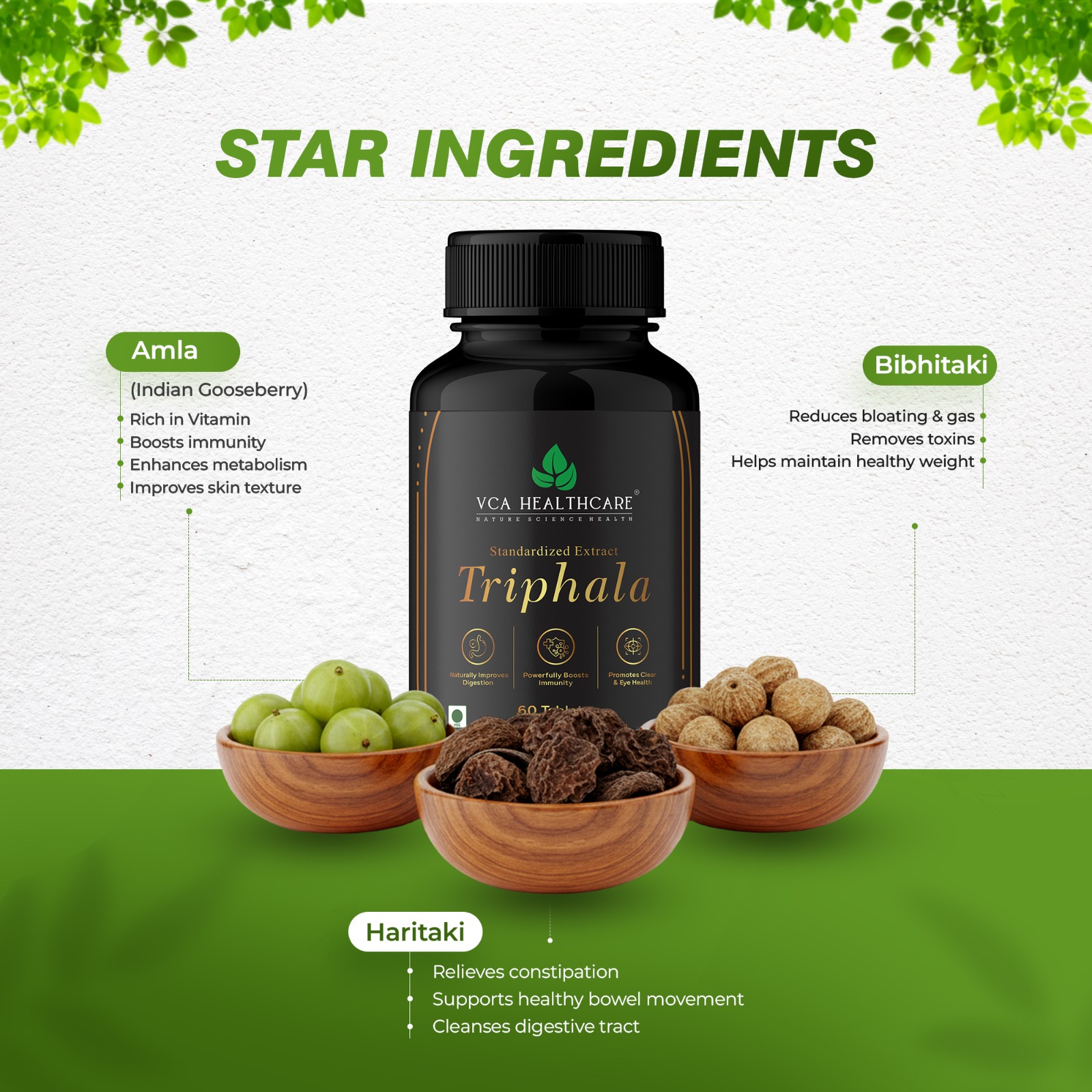 VCA Healthcare Standardized Triphala Extract Tablets bring the timeless wisdom of Ayurveda in a modern, easy-to-consume form. Made from the powerful blend of Amla, Haritaki, and Bibhitaki, Triphala is one of the most trusted Ayurvedic medicines for digestion, stomach health, and natural detoxification.